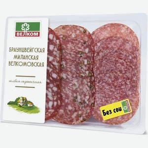 Колбаса Велком Ассорти Брауншвейгская Велкомовская Миланская сырокопченое нарезка, 90 г