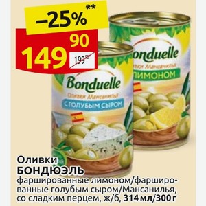 Оливки БОНДЮЭЛЬ фаршированные лимоном/фаршированные голубым сыром/Мансанилья, со сладким перцем, ж/б, 314 мл/300 г