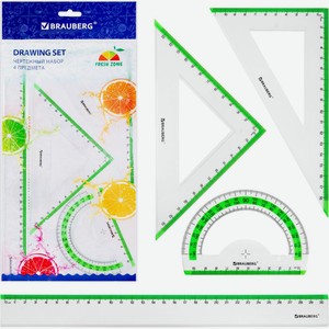 Набор чертежный Brauberg Fresh Zone, линейка 30 см, 2 треугольника, транспортир, 4 предмета, с салатовой шкалой (210764)