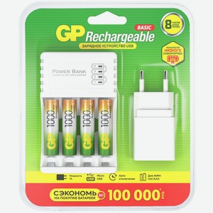 Зарядное устройство GP USB + 4 аккумулятора АAА (HR03) 1000mAh, адаптер (GP 100AAAHC/CPBA-2CR4)