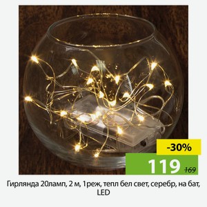 Гирлянда 20ламп, 2 м, 1реж, тепл бел свет, серебр, на бат, LED