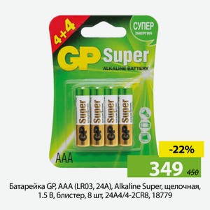 Батарейка GP, ААА (LR03, 24A), Alkaline Super, щелочная, 1.5 В, блистер, 8 шт, 24A4/4-2CR8, 18779