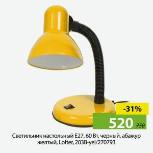 Светильник настольный E27, 60 Вт, черный, абажур желтый, Lofter, 203В-yel/270793